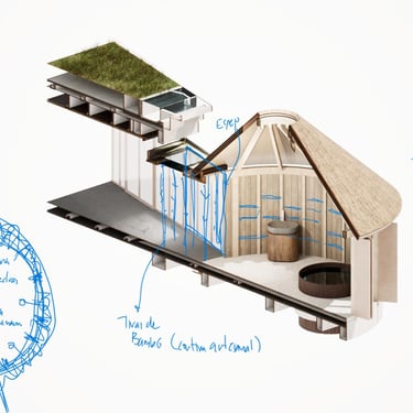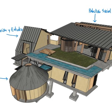 Las palabras fluyeron como pistas: para Janeth, una copa de vino en un espacio exterior pero resguardado, un lugar para el ritual, el contacto con la luna. Para Juan, la luz del sol debía recorrer el espacio en la mañana. Para Gerardo, el agua debía moverse por todo el lugar como una red viva. Así nació la primera certeza: la lluvia no debía ser un problema, sino un gozo. La síntesis fue un cuarto de baño circular, amplio, con un jardín interior.